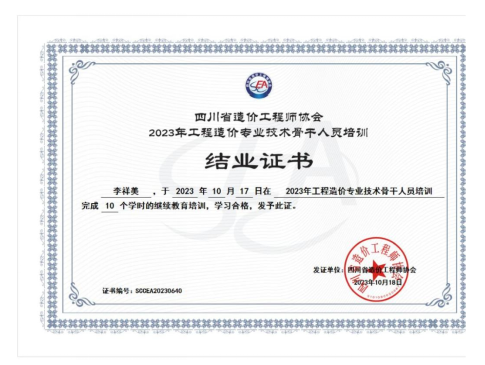 恭喜马凯斐、李祥美获得2023年工程造价专业技术骨干人员培训结业证书